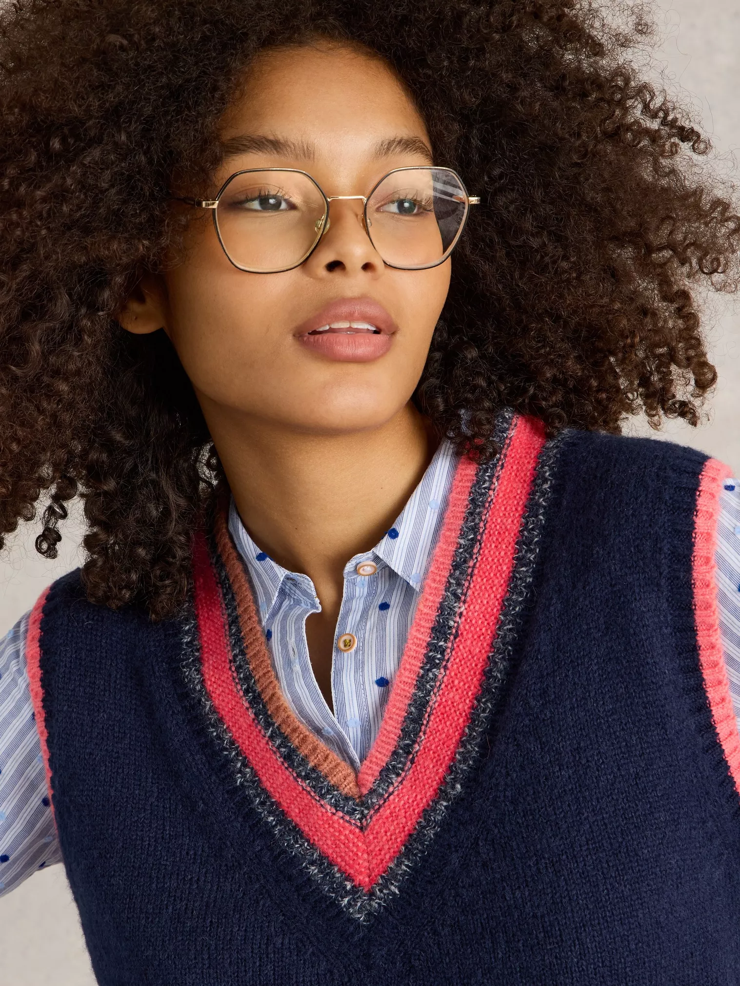 This nice, knitted tank is a little bit quirky. (The best ones usually are.) It has a slightly mis-matched stripe at the bottom. And slightly different colours at the top. But don’t worry, it’s meant to be like that. Perfectly imperfect.